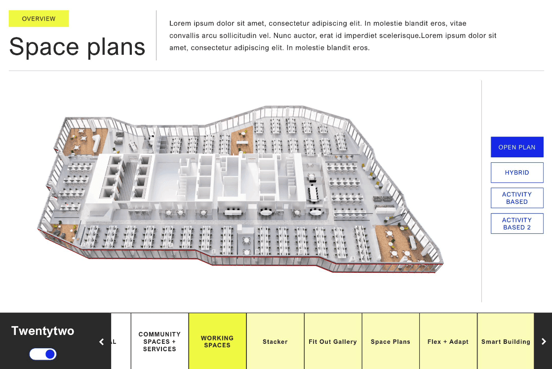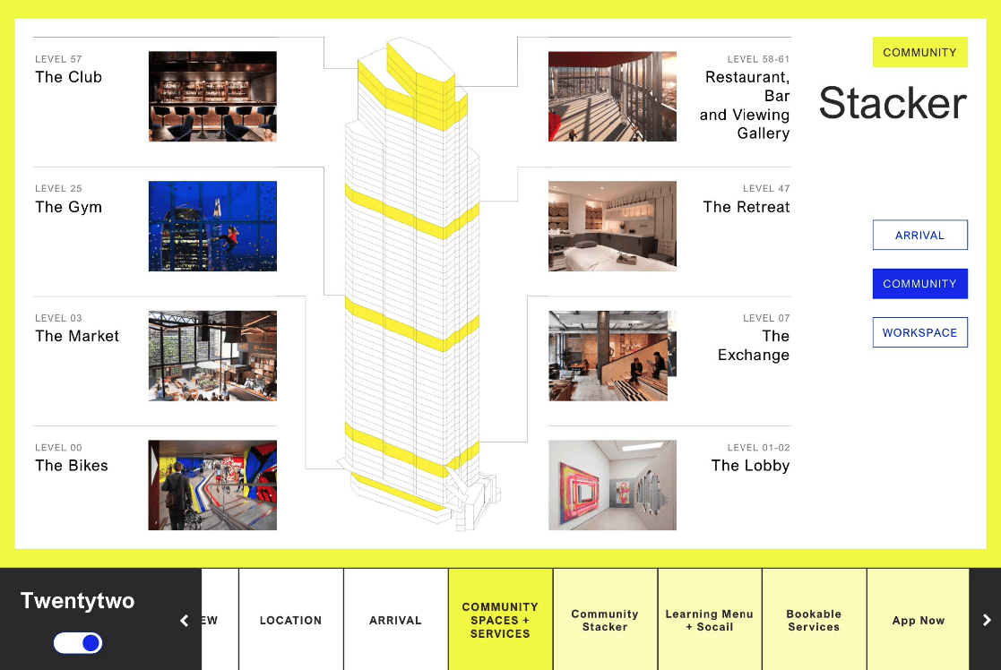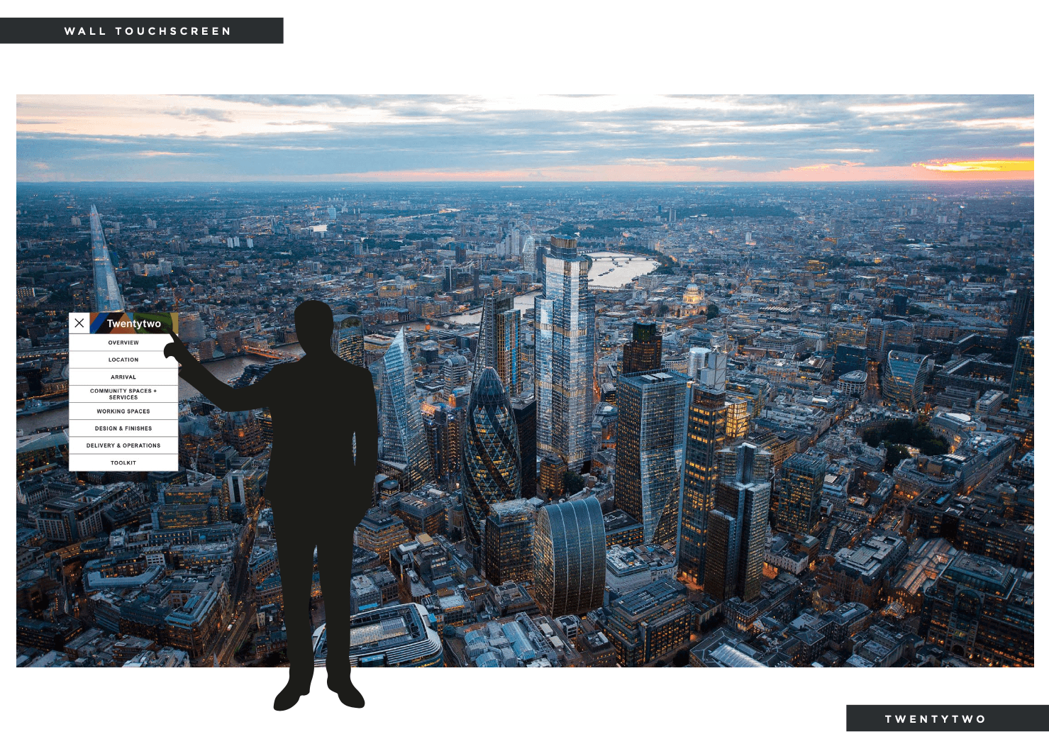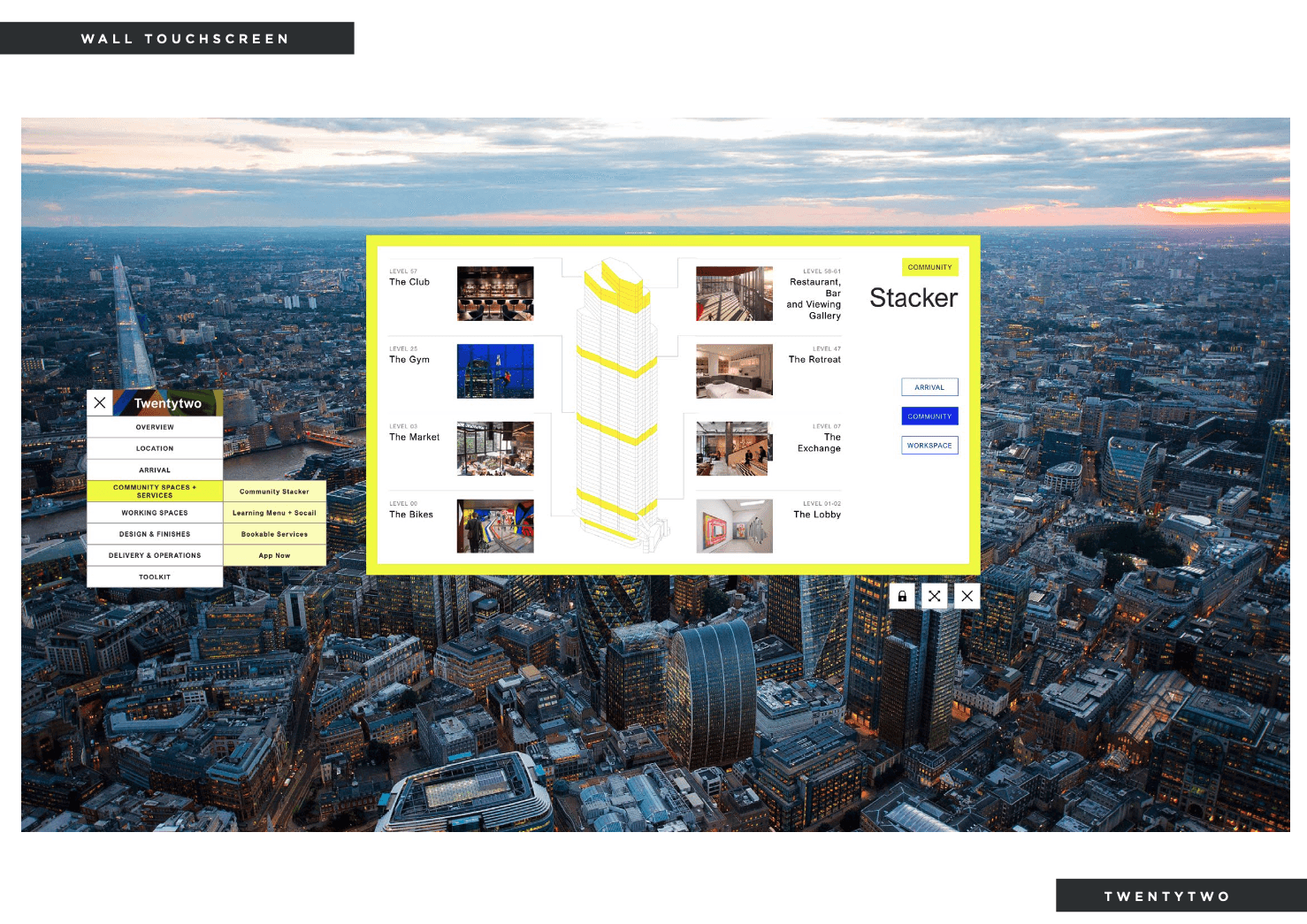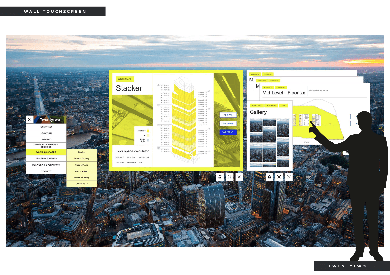 The centrepiece of the wall experience was the interactive stacker — a visual representation of 22 Bishopsgate in cross-section, with every floor selectable and explorable.