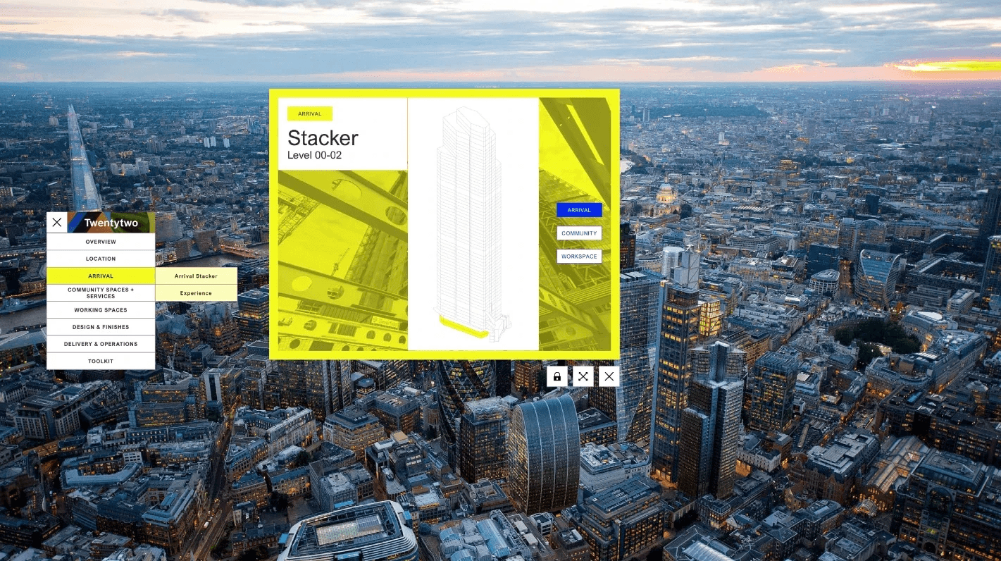 The solution was a large-format interactive wall in the building's marketing suite, paired with a tablet app that could operate independently or mirror the wall for presenter-led sessions. Together, they gave potential tenants a way to explore the building, its floors, its layouts, its amenities, in a format that felt as impressive as the address.