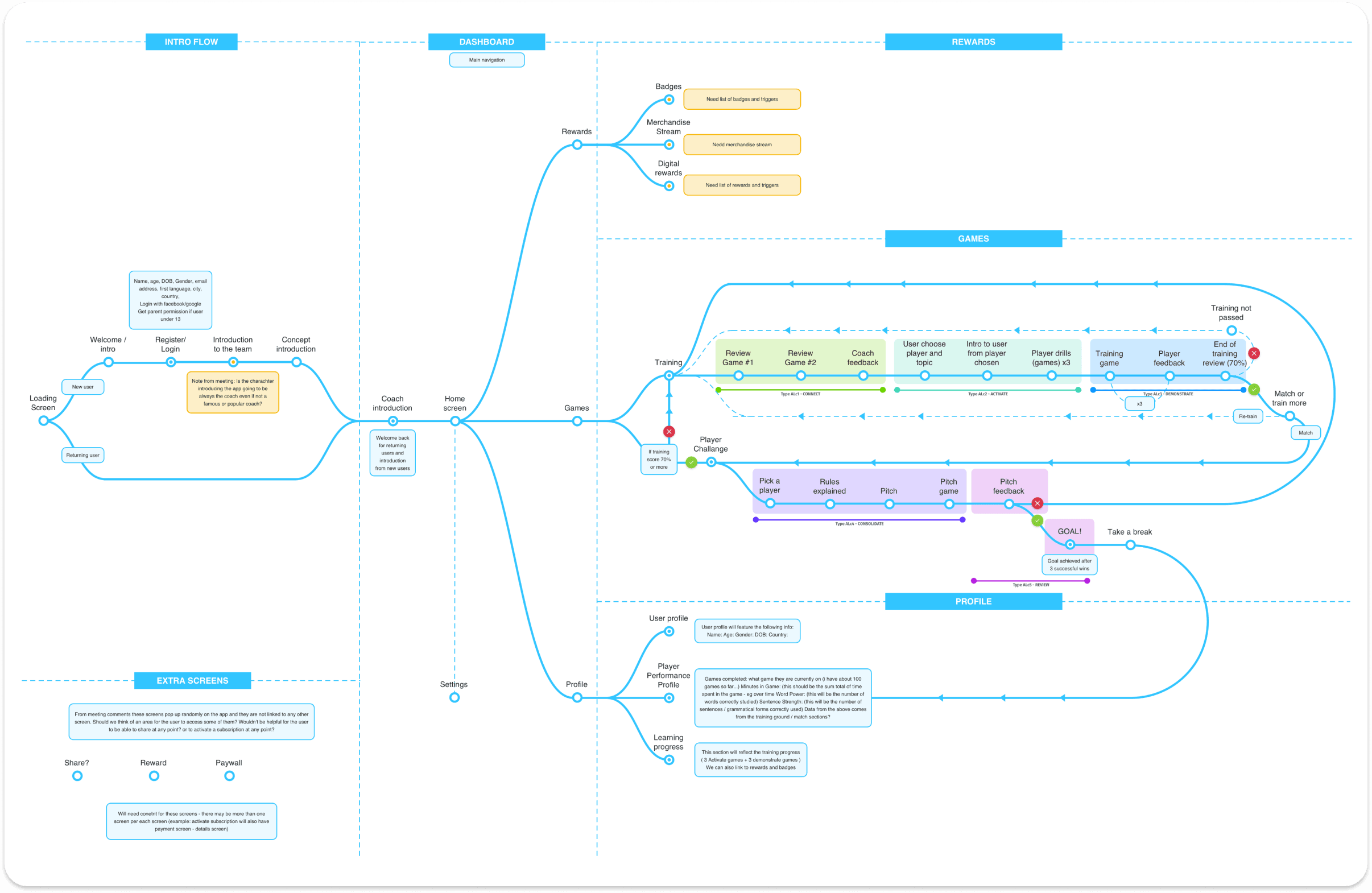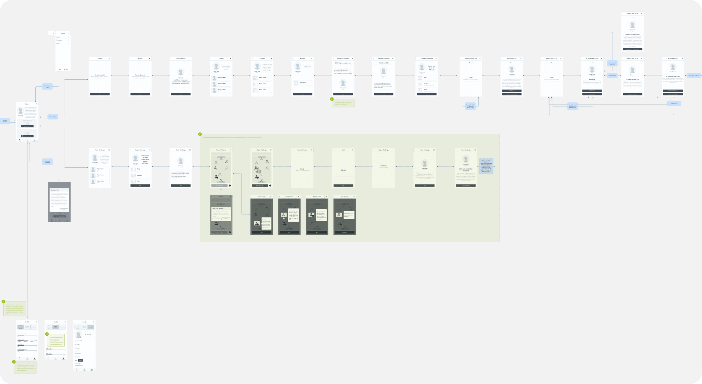End-to-end UX and UI design: onboarding, home, training games, player challenges, progress tracking, badges and rewards