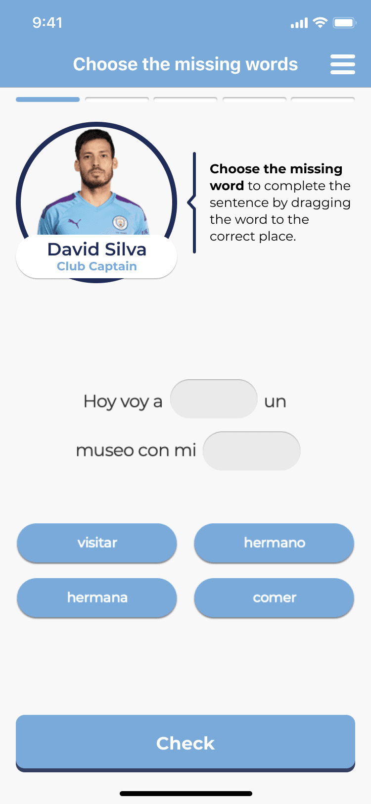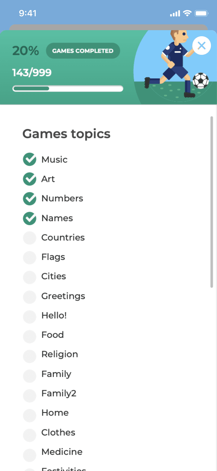 Challenges introduce time pressure and difficulty levels, adding the competitive element that makes the football metaphor feel earned. Completing a challenge within the time limit, at the right difficulty, is the moment the app feels like a game, not a lesson.