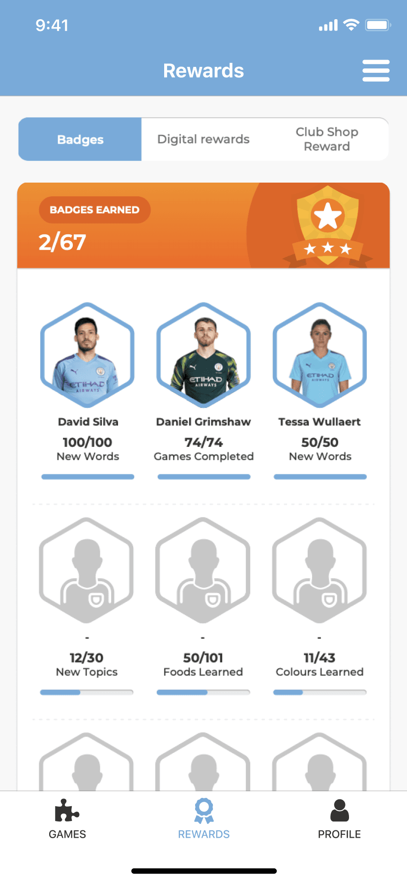The rewards system gives the learning progression a tangible destination. Completing training sets, finishing challenges, and hitting performance milestones unlocks badges, both digital and physical.